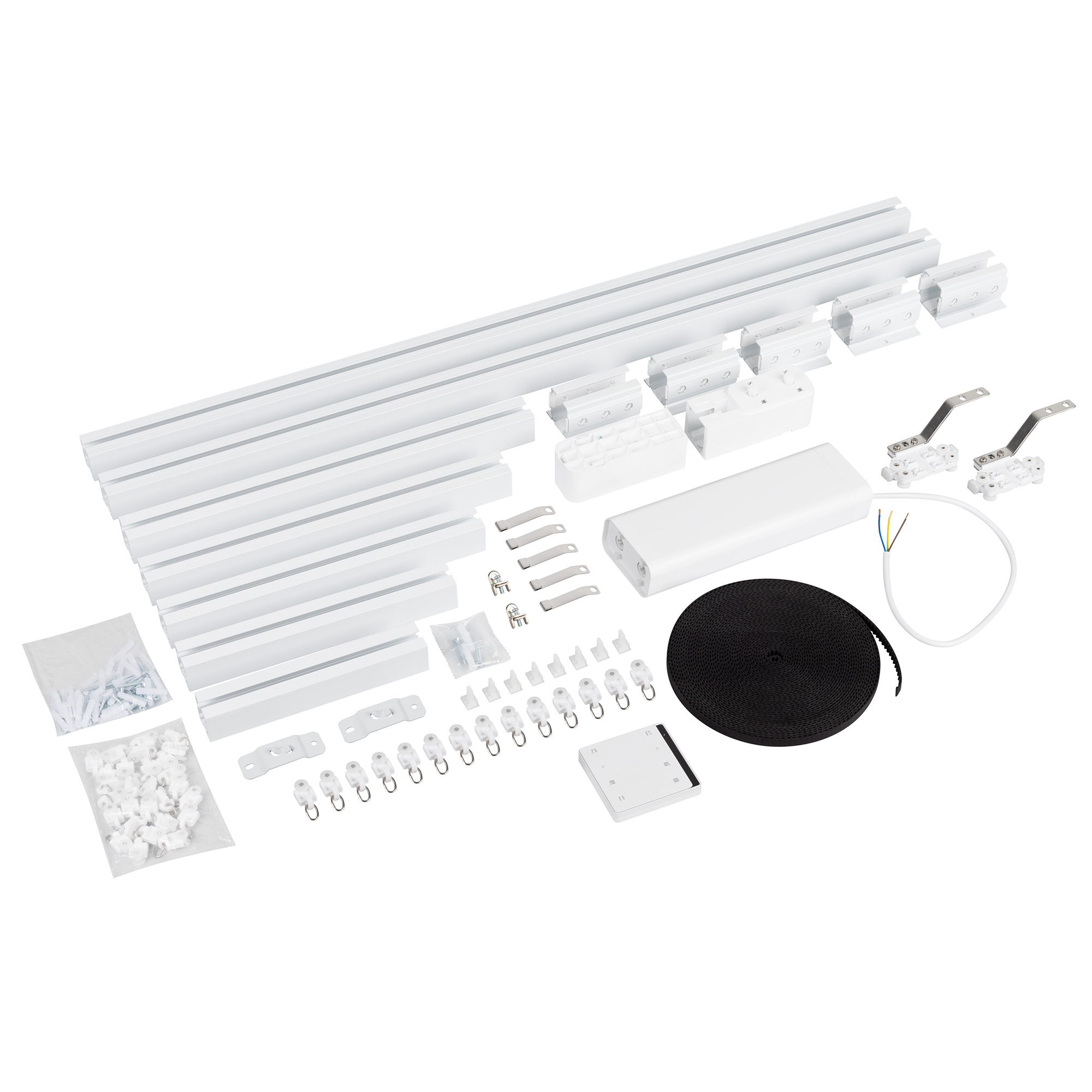 1 мотор, 1 пульт дистанционного управления, алюминиевый профиль 1,6 мм (0.9м 2 шт., 0.4м 1 шт., 0.35м 1 шт, 0.3м 1 шт, 0.25м 1 шт, 0.2м 1 шт), 5 соединителей 10 см, 2 шкива, ремень 14м, 2 направляющих бегунка, 26 бегунков, 2 фиксатора, 2 кронштейна, 4 крюка, 27 саморезов с дюбелями