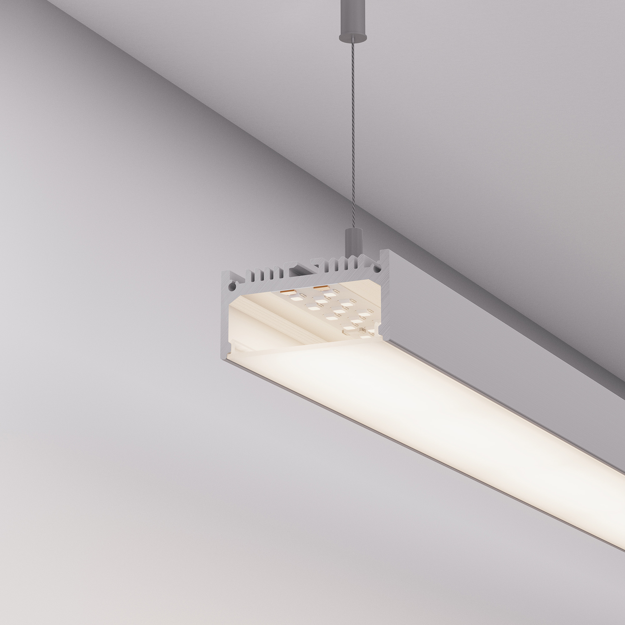 Алюминиевый анодированный подвесной профиль для светодиодных лент и линеек. Габаритные размеры (L×W×H): 2000x48x24 мм. Ширина площадки для ленты 35 мм. Экраны, заглушки и другие аксессуары приобретаются отдельно. Цена за 1 метр.