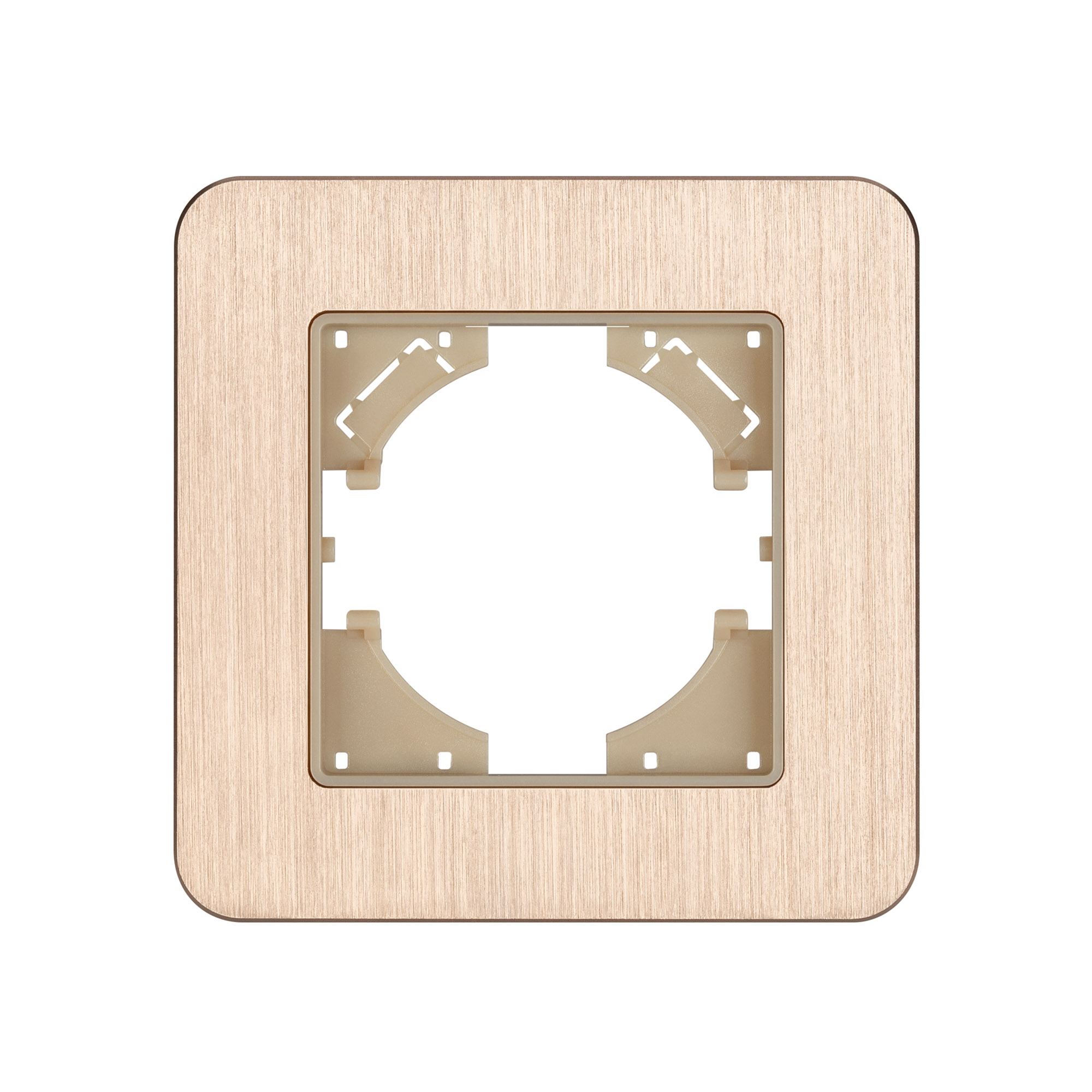 Рамка из серии AKIRY представляет собой комбинацию в виде основы из тугоплавкого пластика и 3-х миллиметровой накладки из алюминиевого сплава. Корпус выполнен в золотом цвете и сатинированной поверхностью с высотой 7мм, что позволяет гармонично встроить в интерьер любого современного дизайн-проекта. Невидимая часть из тугоплавкого пластика, для надежной фиксации механизма. Грани алюминиевой накладки аккуратно обработаны и отшлифованы, чтобы обезопасить пользователя при установке и демонтаже. Рамка предназначена под встраиваемые механизмы.
