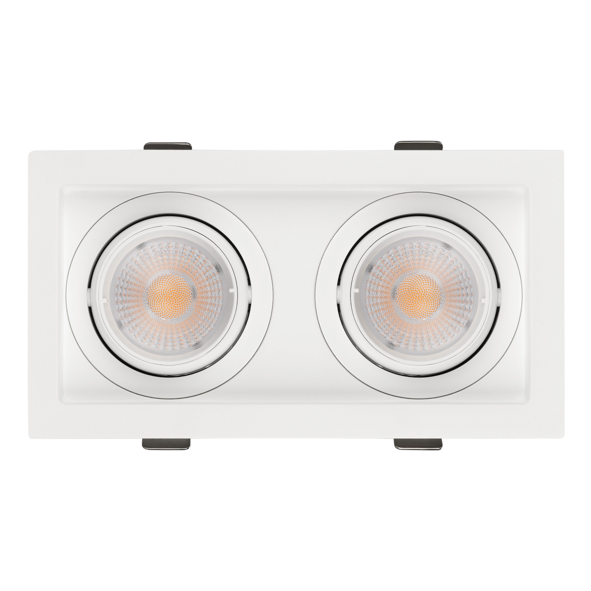 Встраиваемый карданный светильник. Мощность 2х12 Вт, св. поток 2788 лм, 116 лм/Вт, тёплый 3000 K, CRI>92, угол 40°, напряжение питания 230 В. Белый корпус из алюминия, белая вставка, степень защиты IP20. Размер: длина 170 мм, ширина 90 мм, высота 80 мм. Монтаж встраиваемый, установочное отверстие: длина 155 мм, ширина 75 мм. Драйвер 27-40 В, 300 мА, пульсация <2%.